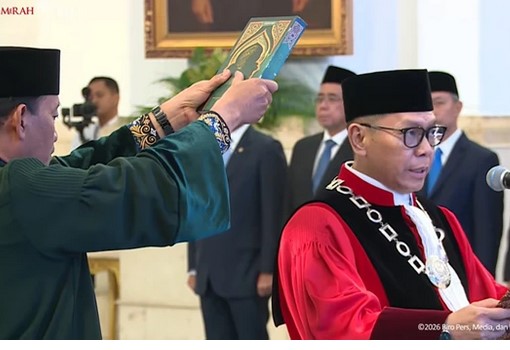 Adies Kadir yang Mantan Wakil Ketua DPR membacakan sumpah yang diawali dengan menyanyikan lagu Indonesia Raya. Lalu dibacakan Keputusan Presiden Nomor 9/P Tahun 2026 tentang Pemberhentian Pengangkatan Hakim Konstitusi.