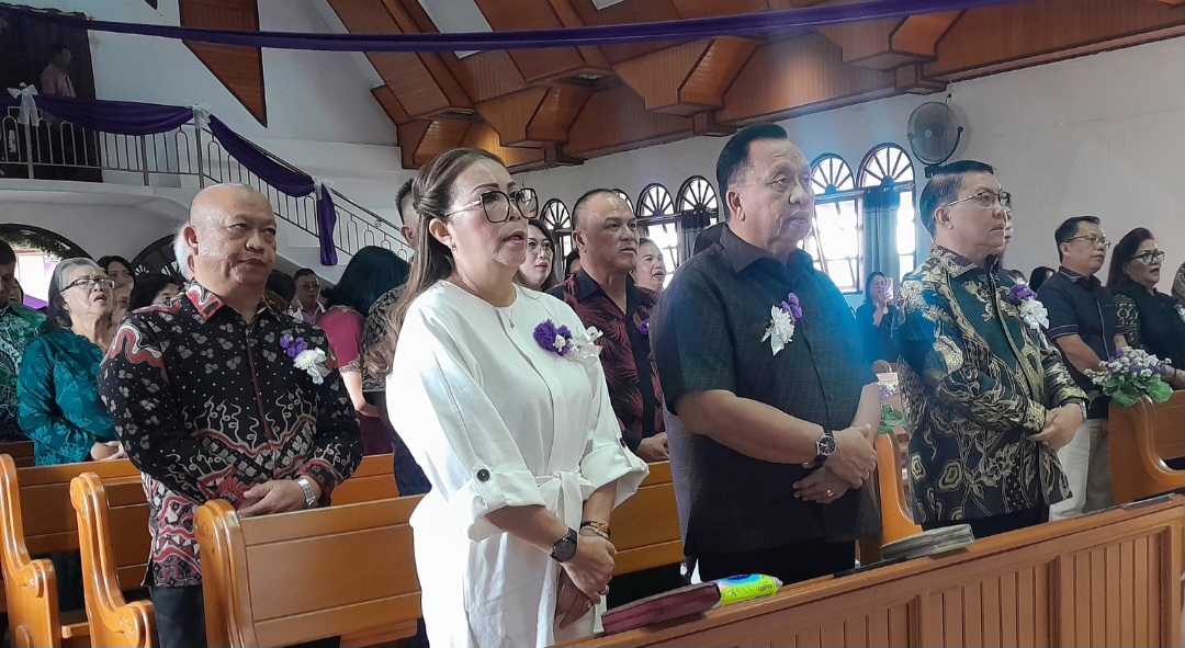Hadir di tengah jemaat, Bupati Minahasa Dr. Robby Dondokambey, S.Si, MAP, didampingi Ketua TP-PKK Pnt. Ny. Martina Dondokambey – Lengkong, SE.