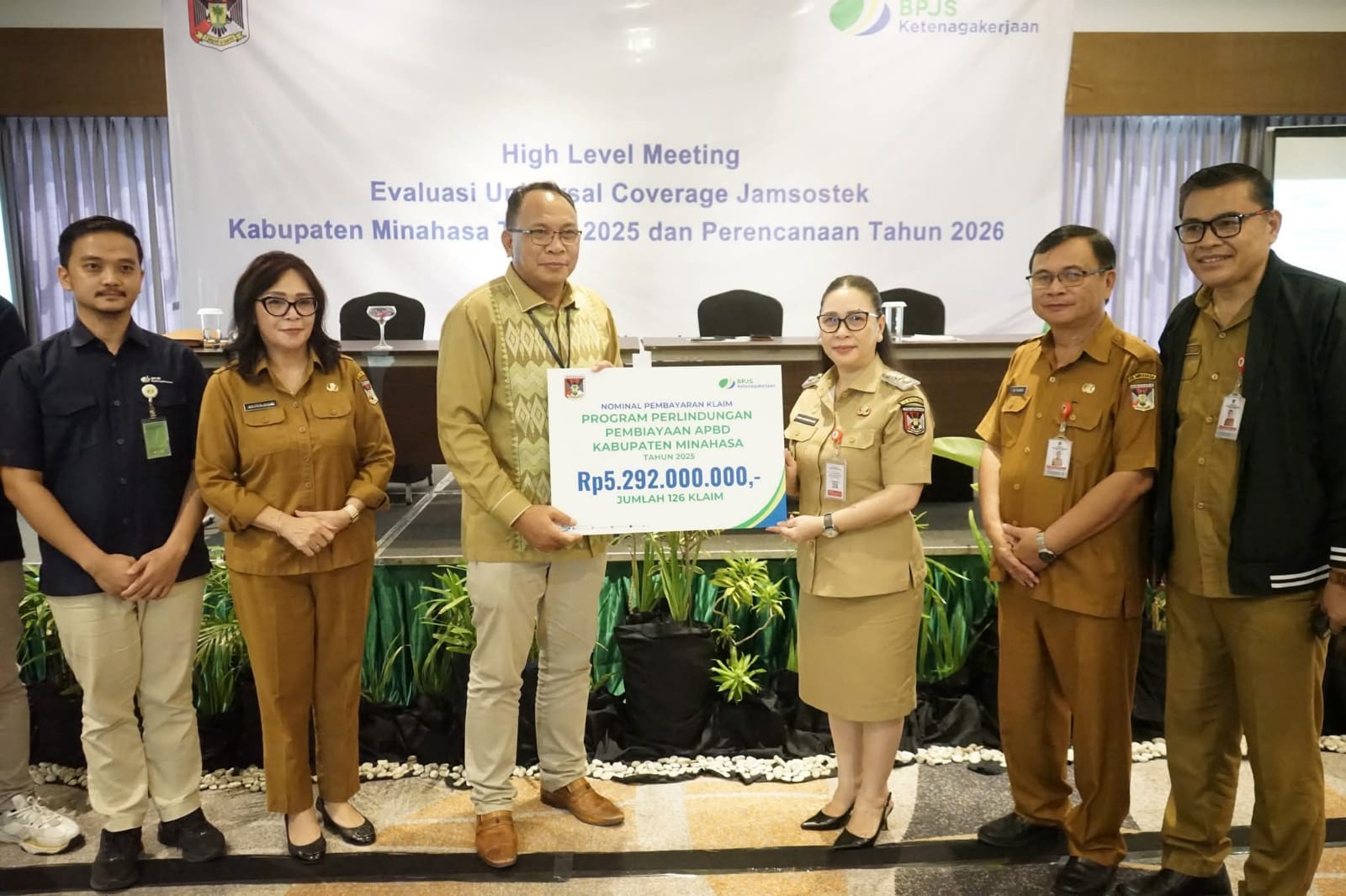 Selain evaluasi, acara tersebut juga dirangkaikan dengan penyerahan simbolis Pembayaran Klaim Program Perlindungan Pembiayaan APBD Kabupaten Minahasa Tahun 2025.