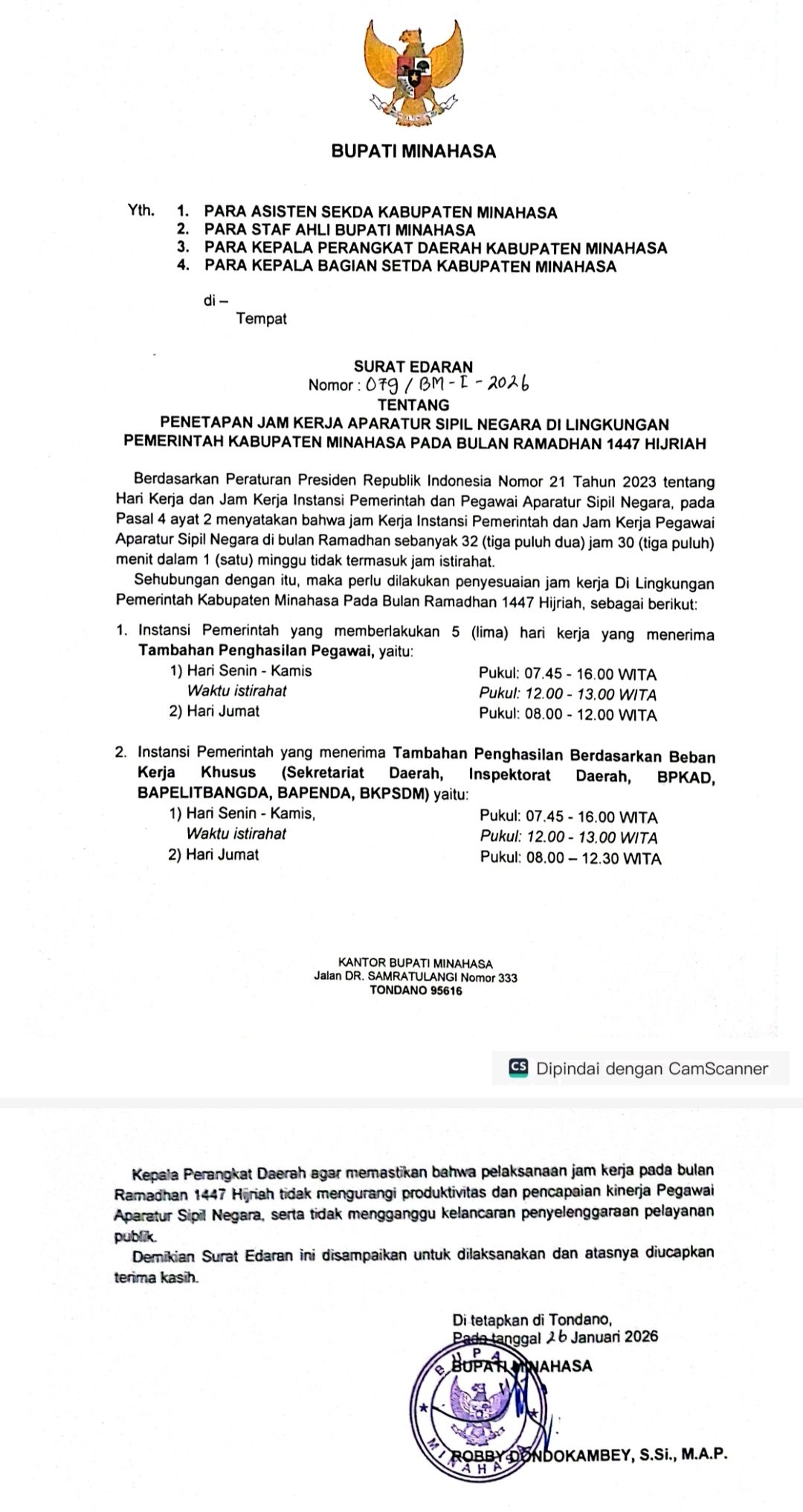 INTANANEWS – Pemerintah Kabupaten Minahasa menetapkan penyesuaian jam kerja bagi Aparatur Sipil Negara (ASN) selama bulan Ramadan 1447 Hijriah atau tahun 2026.