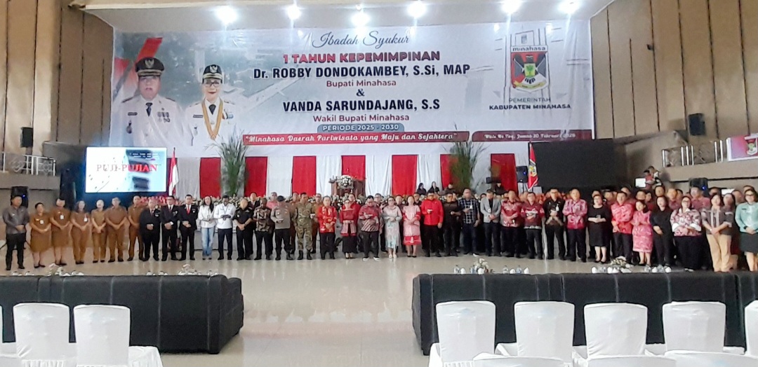INTANANEWS – Pemerintah Kabupaten (Pemkab) Minahasa menggelar ibadah syukur memperingati genap satu tahun masa kepemimpinan Bupati Robby Dondokambey (RD) dan Wakil Bupati Vanda Sarundajang (VaSung).