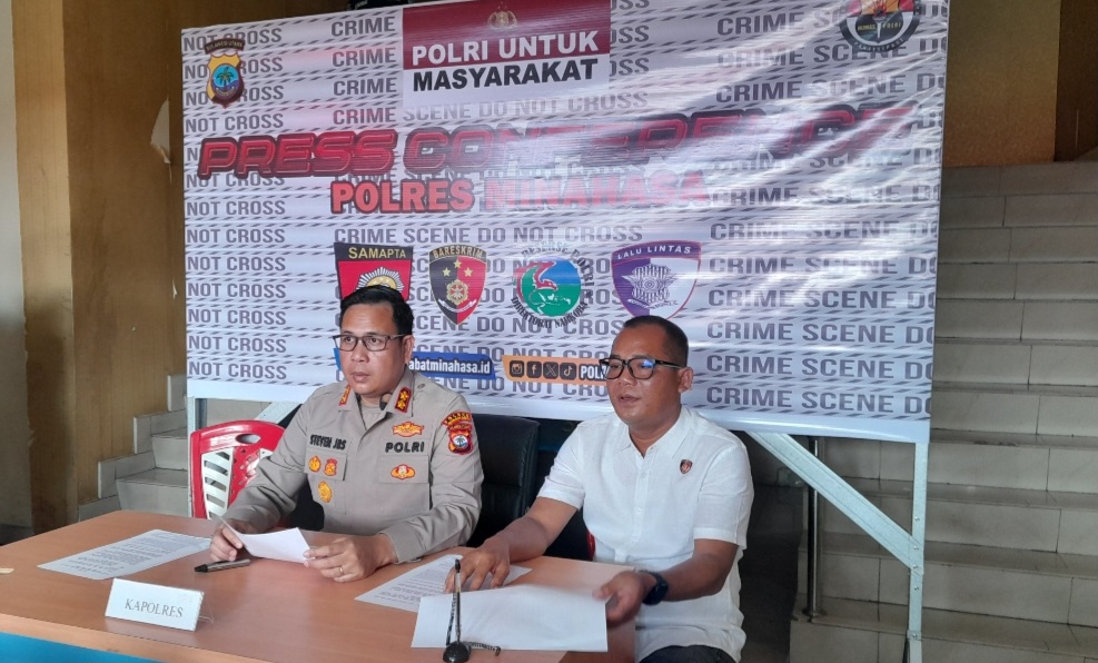 Kapolres Minahasa AKBP Steven J.R. Simbar, SIK, didampingi Kasat Reskrim Polres Minahasa AKP Edi Susanto, S.Sos., menjelaskan kronologi dua tindak pidana yang saling berkaitan.